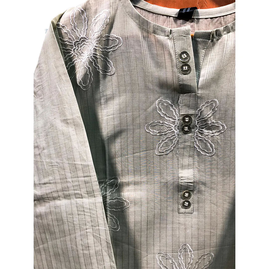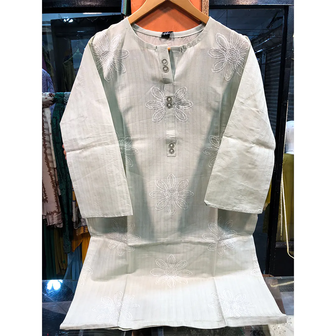 The sophisticated ash-white tone brings a refined charm, while the delicate embroidery adds a graceful touch, making it suitable for multiple occasions. Whether you need a casual embroidered cotton kurti for daily wear, a stylish kurta for office attire, or a chic option for semi-formal gatherings, this top is designed to meet every need.