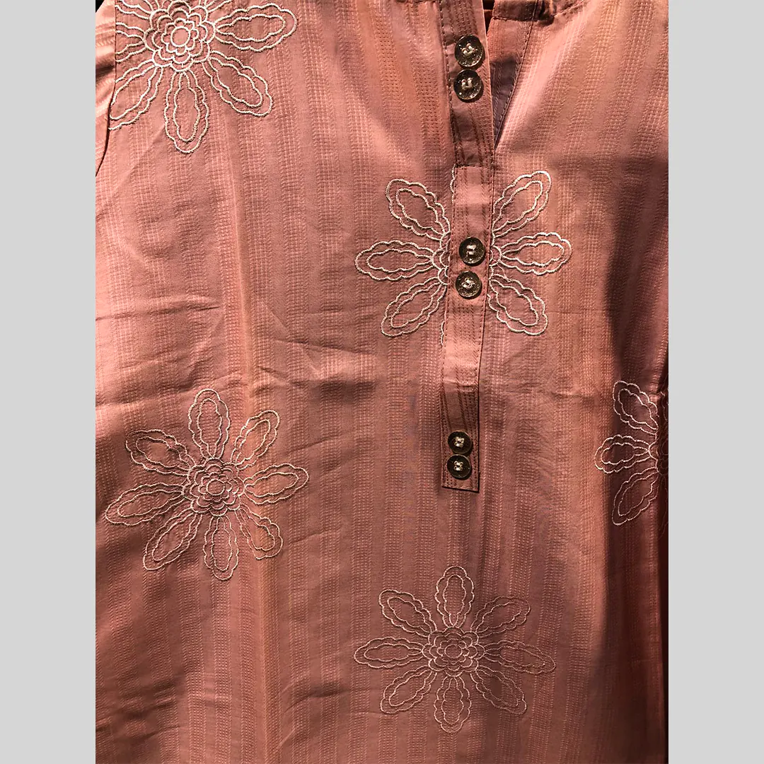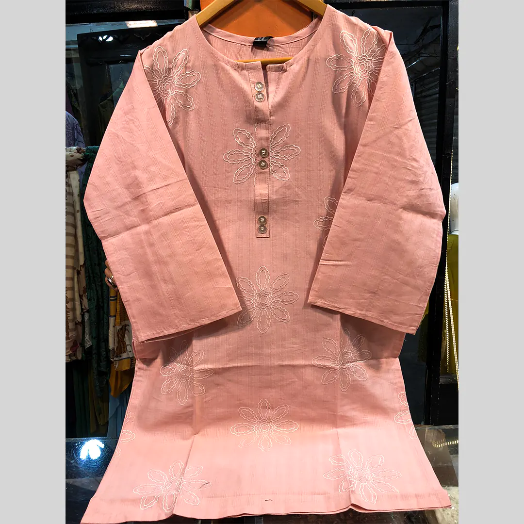 The soft baby-pink shade adds a refreshing feminine touch, while the intricate embroidery elevates its charm, making it a perfect choice for women who love a balance of elegance and comfort. Whether you’re looking for a casual embroidered cotton kurti for daily wear or a stylish embroidered kurta for office and semi-formal gatherings, this piece fits every occasion beautifully.