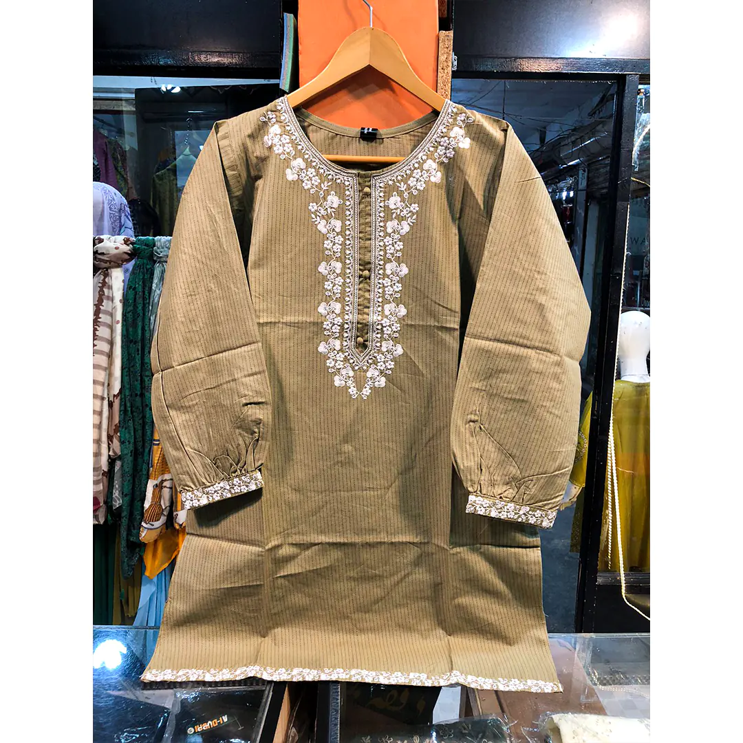 The unique mehndi shade adds a refreshing and graceful vibe, while the fine embroidery detail elevates its sophistication. Whether you’re looking for a casual embroidered cotton kurti for daily wear, a stylish kurta for office, or a chic semi-formal outfit, this piece is a perfect fit.