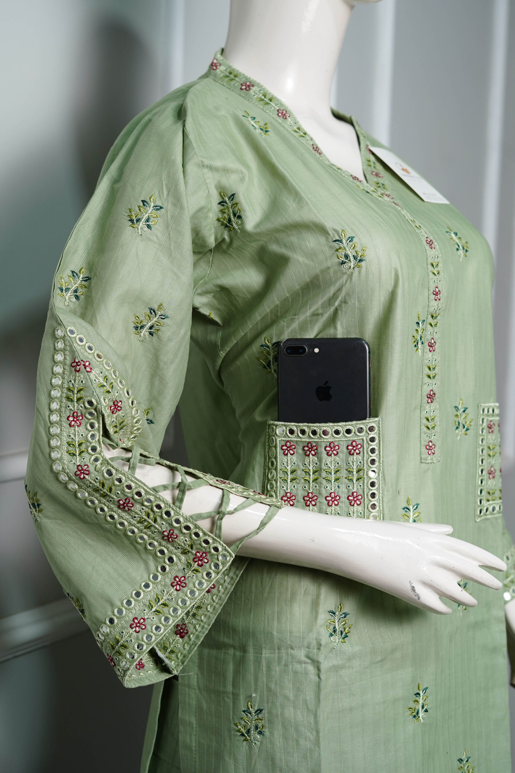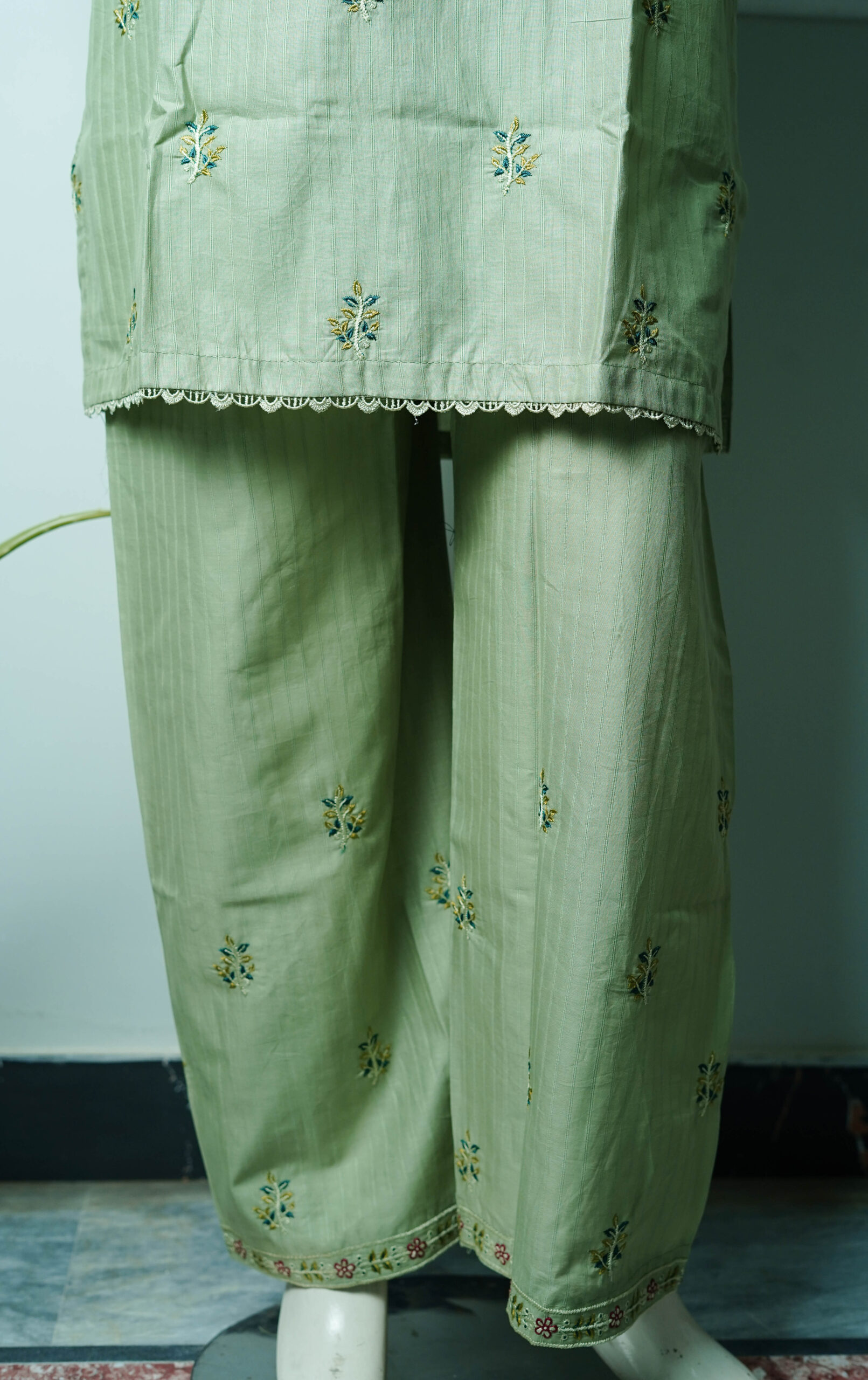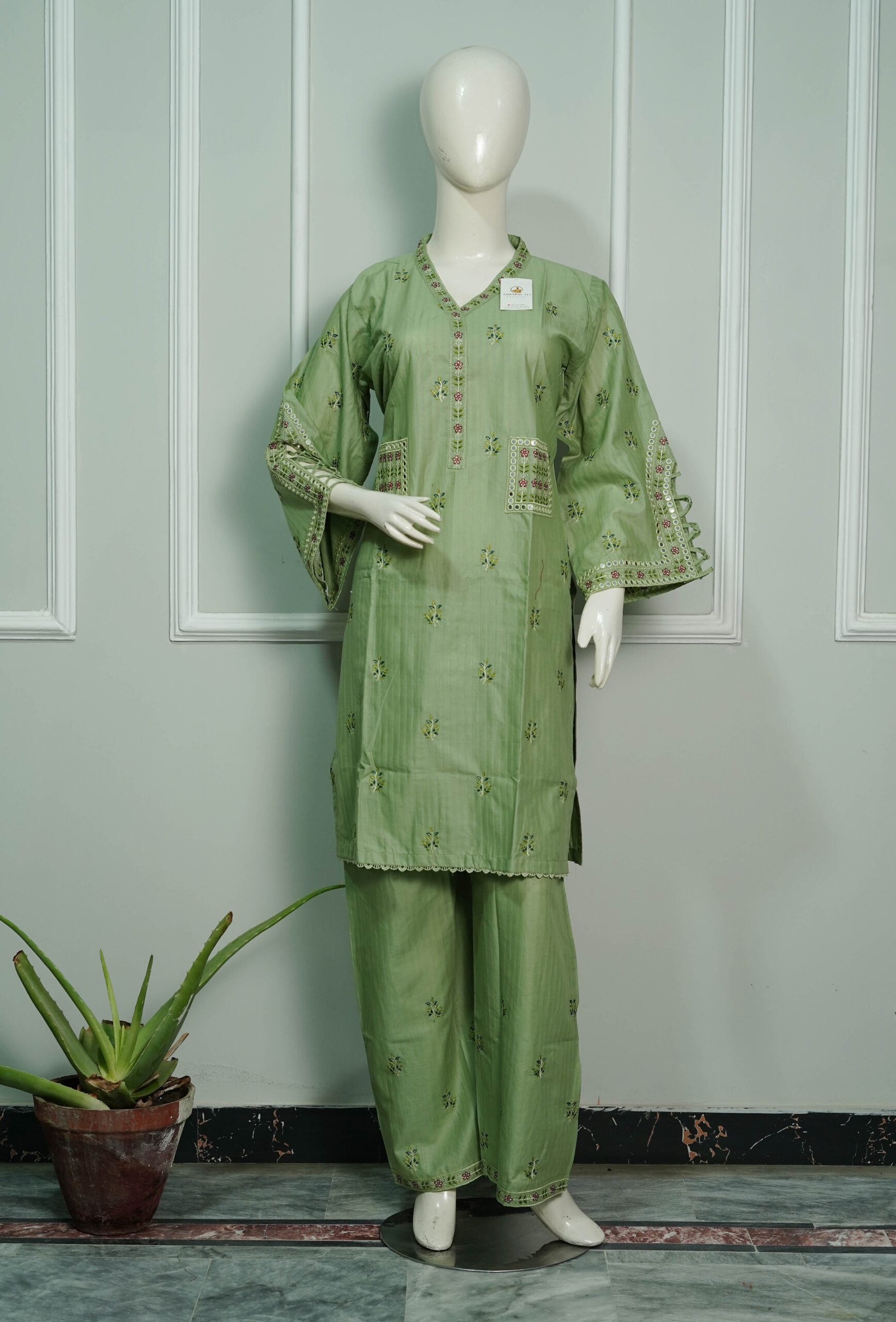 Crafted with care in Pakistan, the Kheesa Pista stitched cotton suit brings together quality, elegance, and comfort – a must-have outfit in every wardrobe.