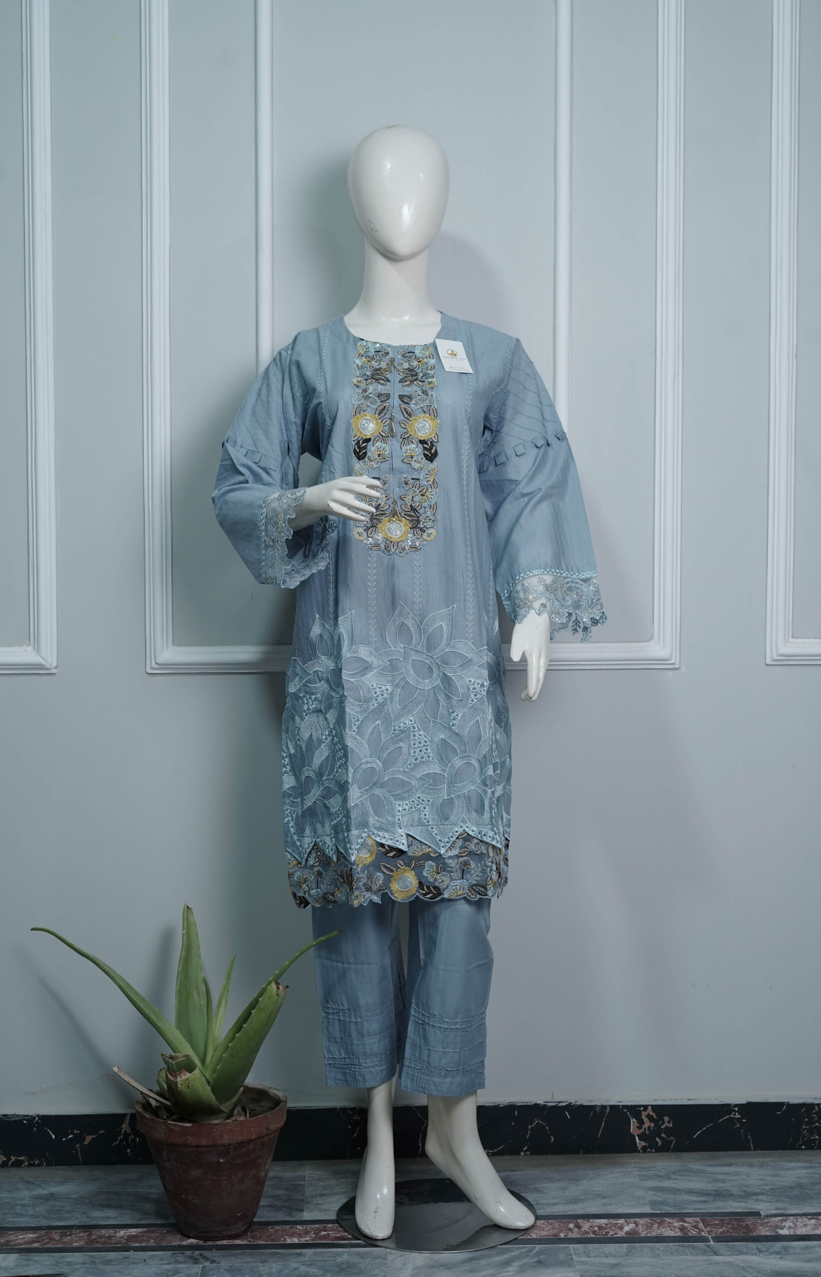 Proudly Made in Pakistan, the Khusbo Fadesky stitched cotton suit showcases Tawakal313Fashion’s commitment to high-quality stitched outfits that balance traditional charm with modern design.