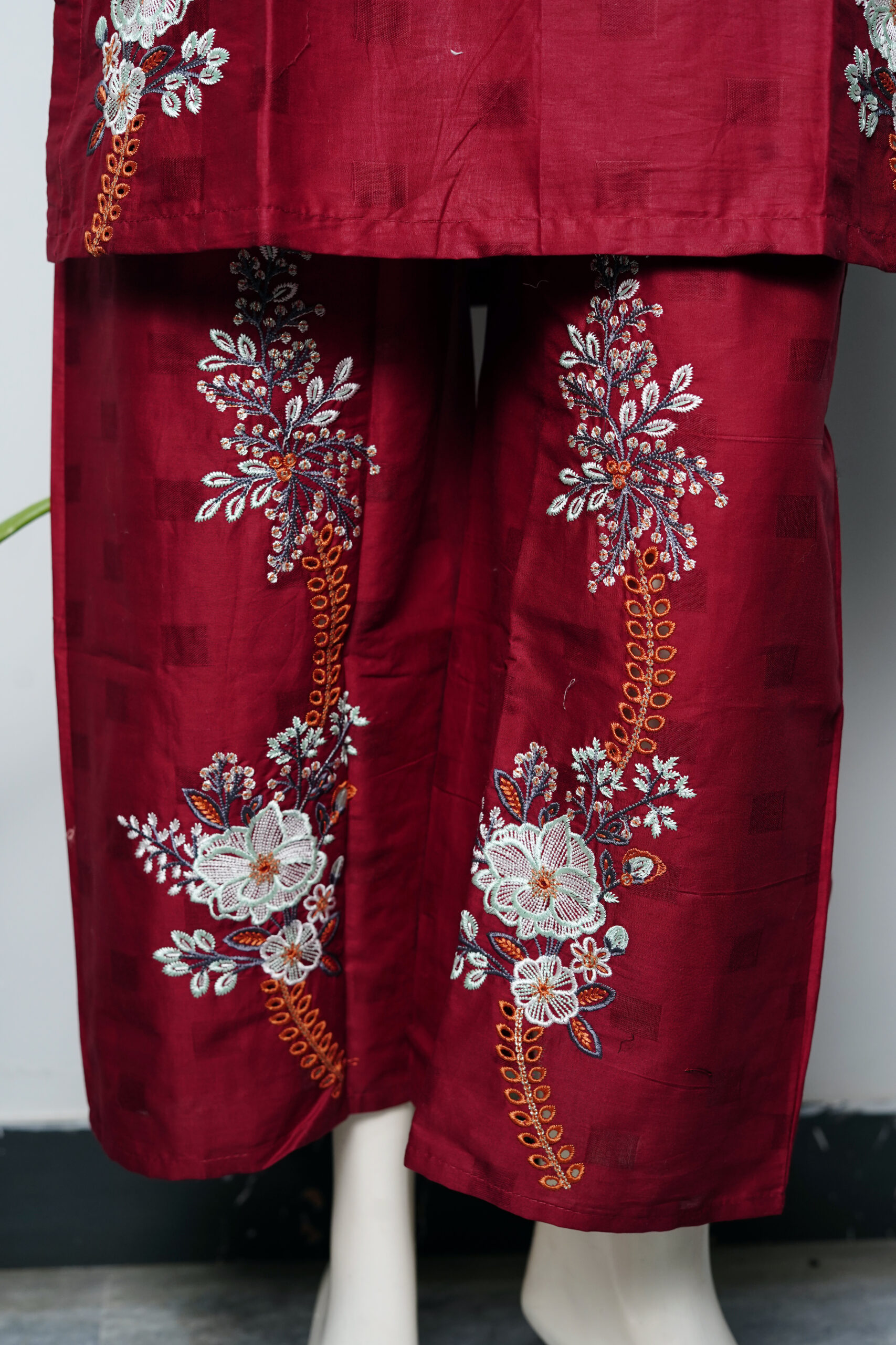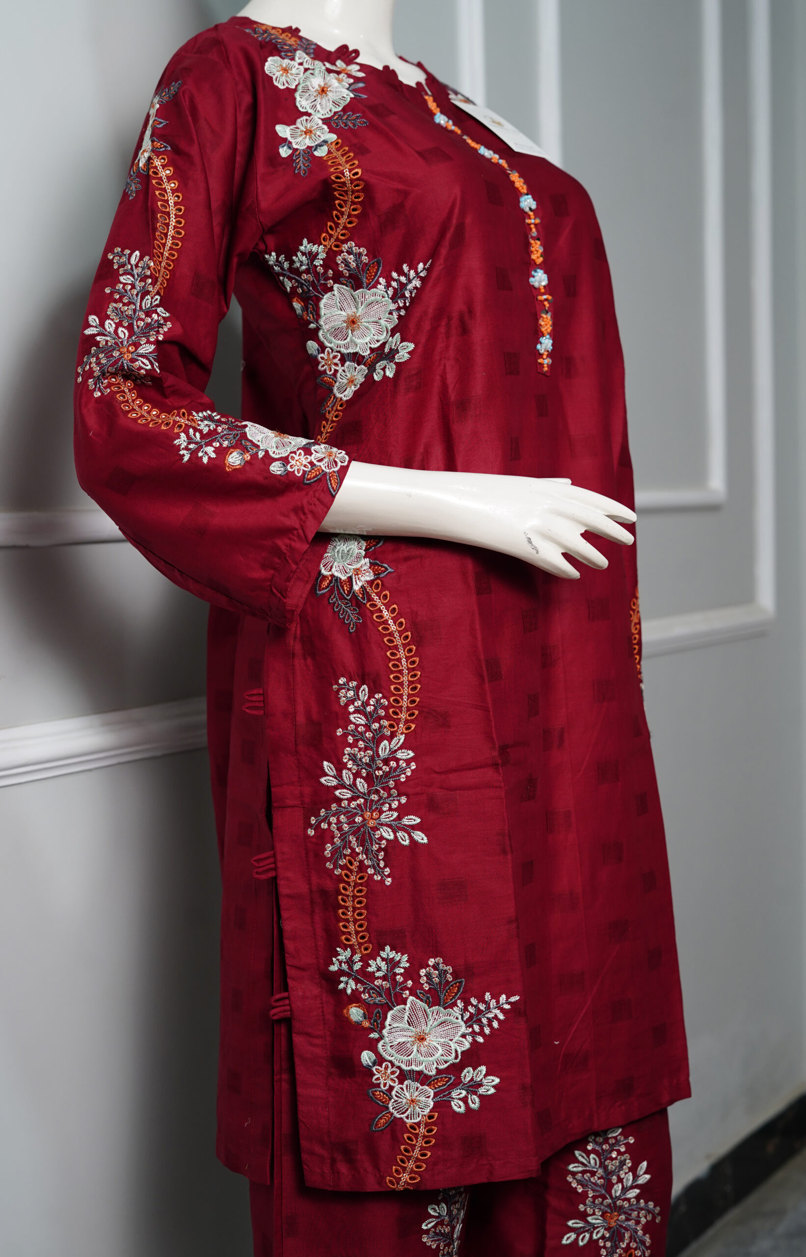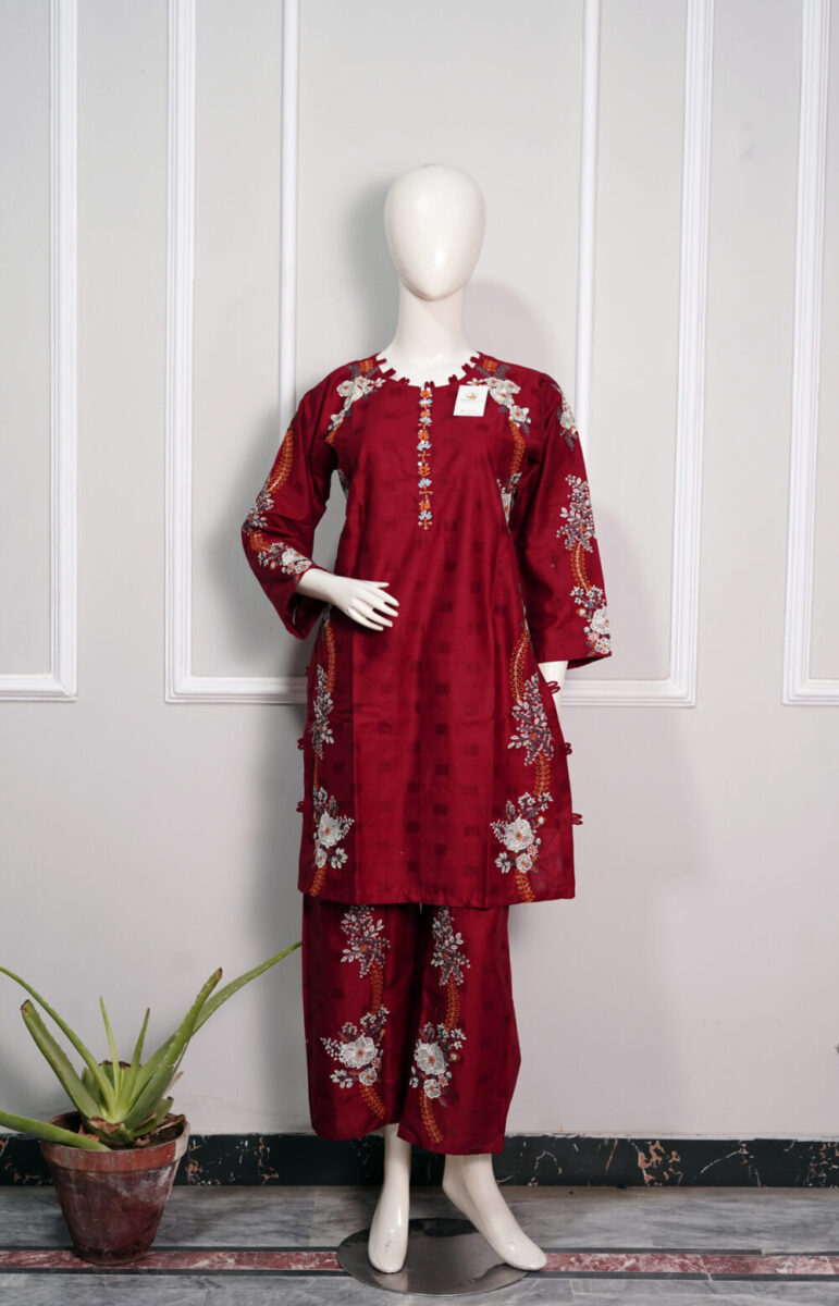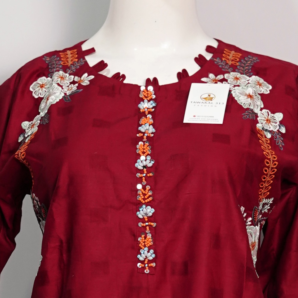 The Ruby Mahroon – 2PC Stitched Cotton Suit for Women from Tawakal313Fashion is a timeless outfit designed for elegance and comfort. Crafted from high-quality cotton fabric, this 2 piece stitched cotton dress features a stylish shirt and matching trousers in a rich mahroon shade.