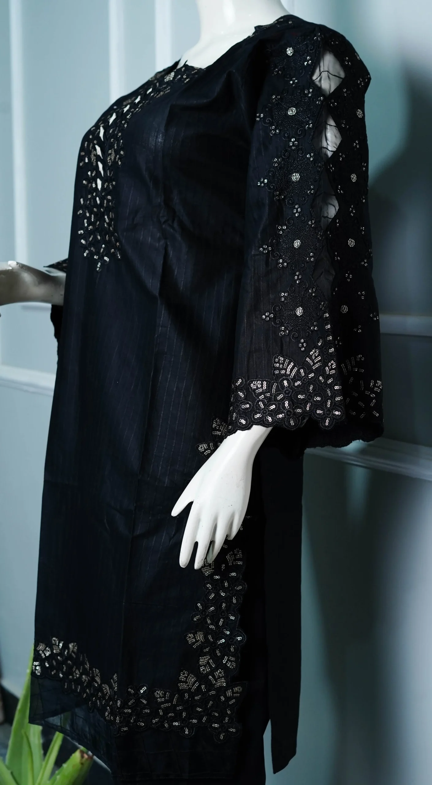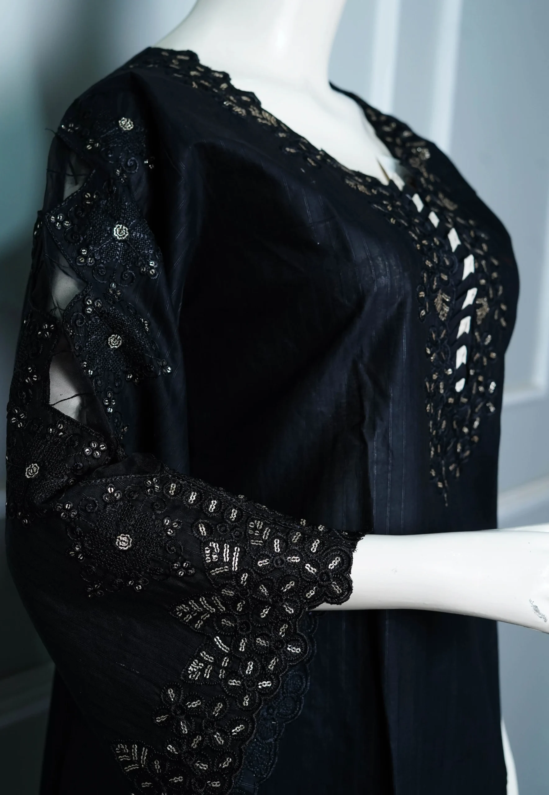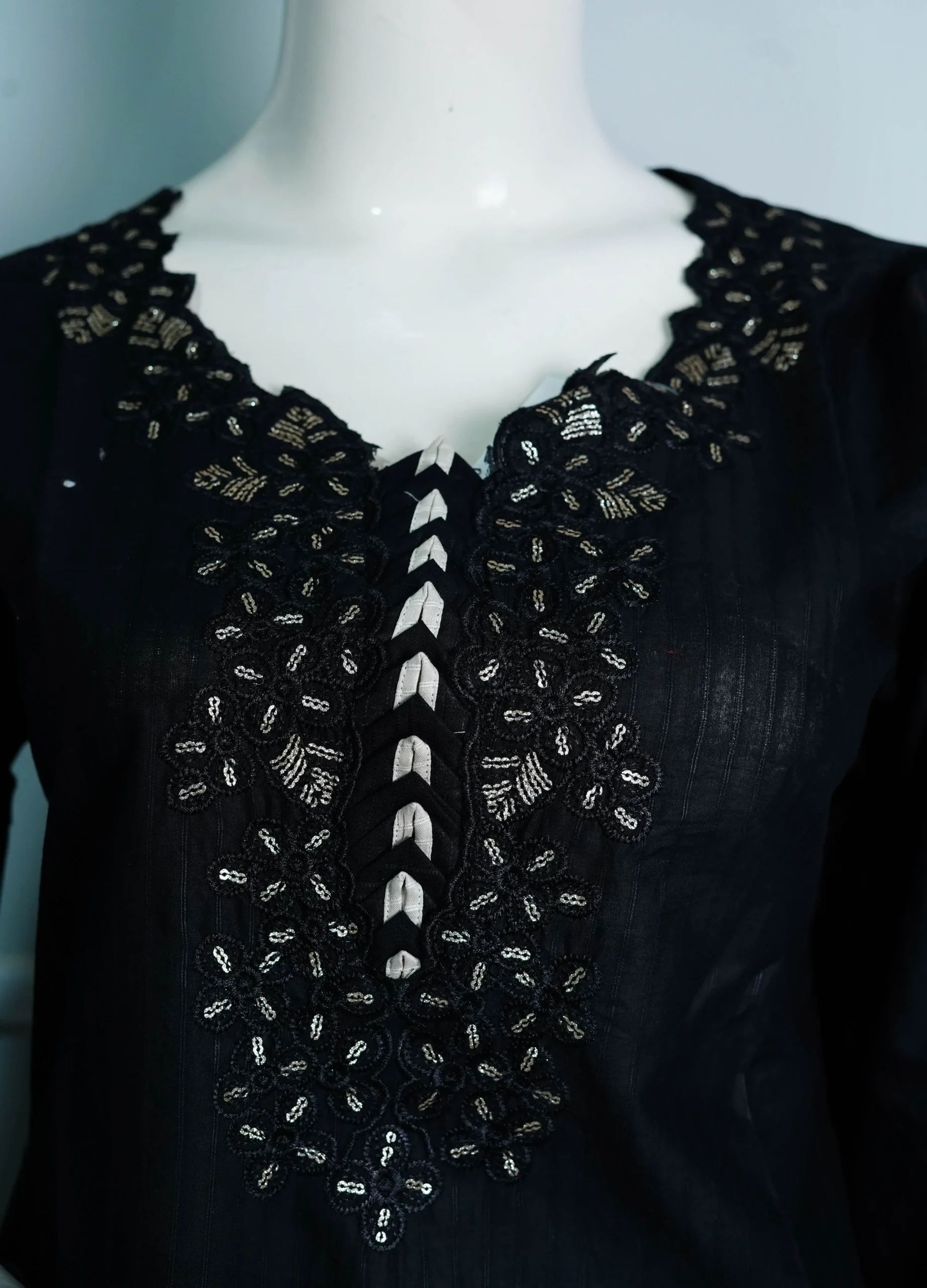 Proudly Made in Pakistan, this black embroidered cotton suit reflects premium craftsmanship and modern fashion aesthetics.