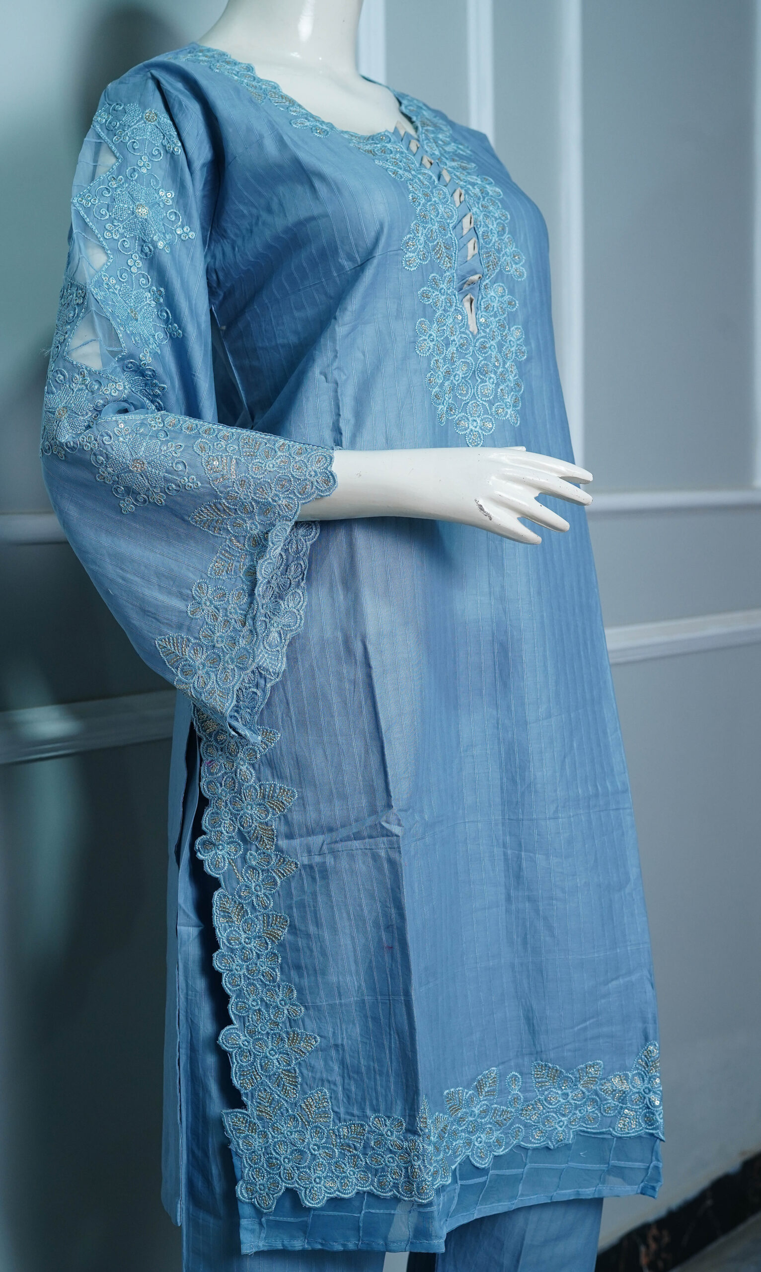 The Senorita Fadesky – 2PC Stitched Cotton Suit for Women from Tawakal313Fashion is a graceful and comfortable outfit, perfect for every occasion. This 2 piece stitched cotton suit includes a stylish shirt and matching trousers in a refreshing light blue (Fadesky) shade.